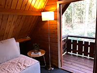 Boven tref je een eerste slaapkamer met een bijzonder comfortabel dubbel bed én een zetelbed. In de kamer is er voldoende ruimte voor het hangen en leggen van kleding. Aan de kamer is een terras dat naar achteren gericht is en volop zicht geeft op het bos én enkel bos. En uiteraard ook de eekhoorntjes en vogeltjes. Als de luiken gesloten zijn is de slaapkamer volledig verduisterd.